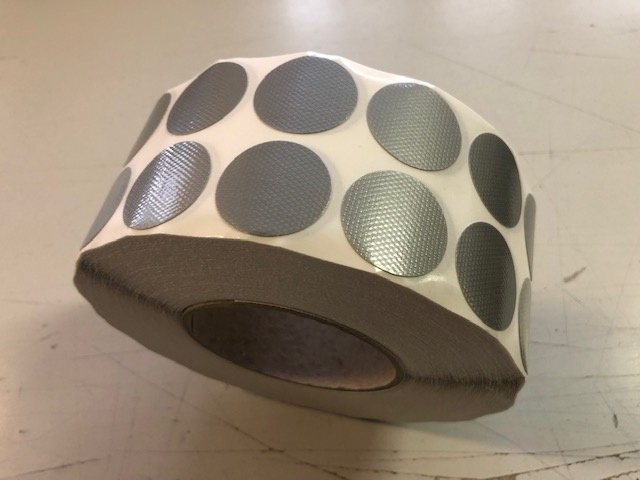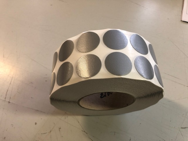 Fixační kolečka o průměru 30 milimetrů ve stříbřité barvě. Na zadní straně mají tlakově aktivované lepidlo a jsou vyrobena z vysoce odolné tkaniny impregnované PP, s lepidlem s vysokou přilnavostí na většinu plastů, lakovaných povrchů, sklo a dřevo. Lepidlo má dobrou teplotní odolnost, a kolečka lze i po delší době odlepit bez zanechání zbytků lepidla. Kolečka se používají k dočasnému přilepování lístků s instrukcemi, vzkazů, obálek s informacemi, ale i pro snadnou dočasnou fixaci lehkých předmětů, zaslepení otvorů a podobně.Fixační kolečka Duct tape ø 30mm ve dvou řadách na roli po 2500 ks nebo 1000 ks