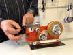 Otevřete plastový kryt a přesvědčte se, že role je správně vložena v unašeči a liner je dobře upevněn na odvíjecím kolečku.Při použití velmi úzkých pásek v šířce 6 mm je potřeba vložit do žlutých pistolí plastový adapter a v červeném dispensoru utěsnit jádro cívky kouskem papírku proti posouvání na ose.