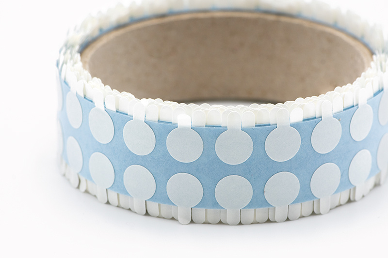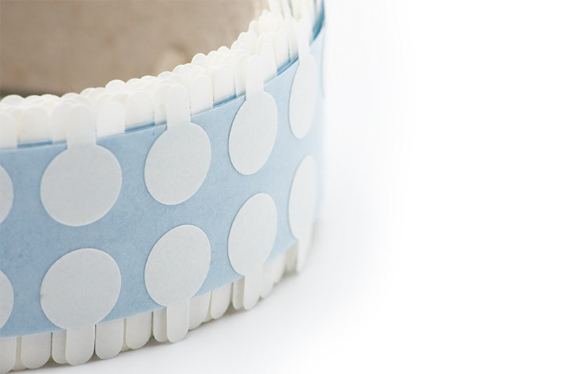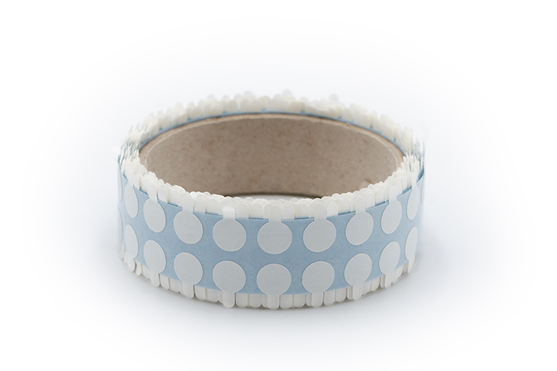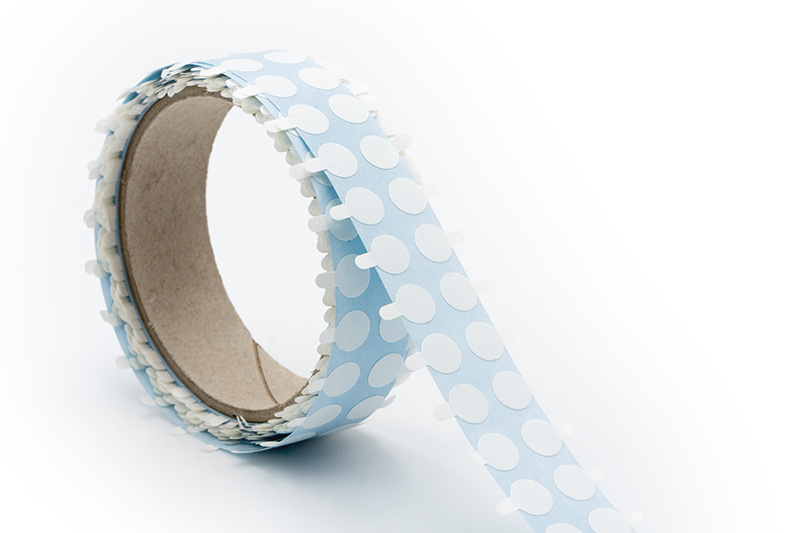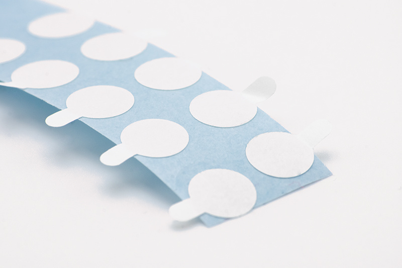 Výseky jsou z průhledné a tenké oboustranné pásky, která má na otevřené straně silně lepivou vrstvu a na zakryté straně slabě lepivou vrstvu.
