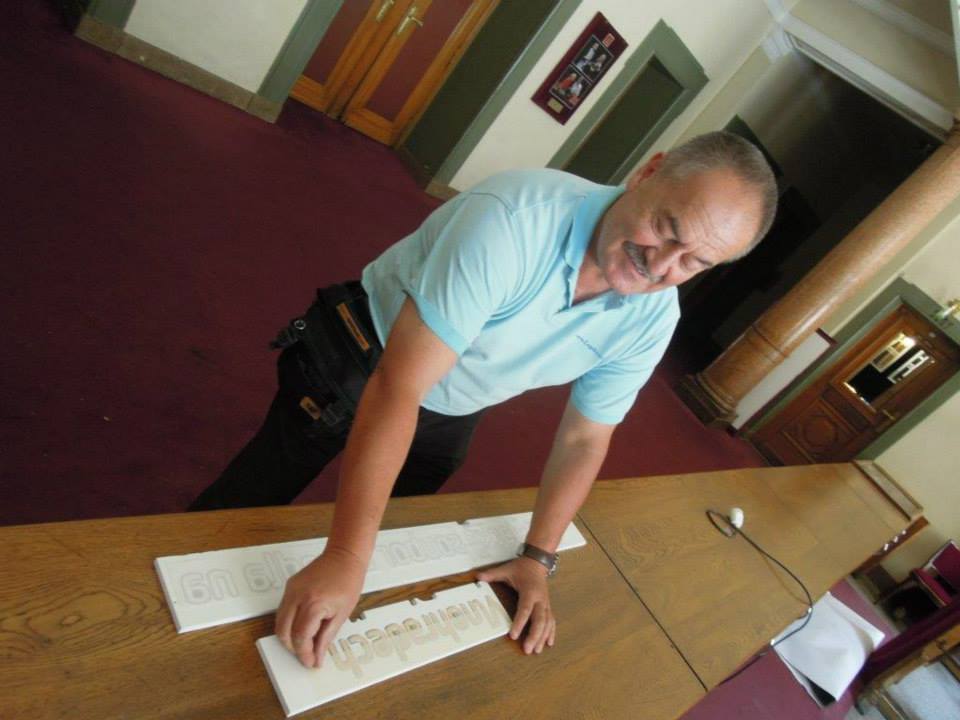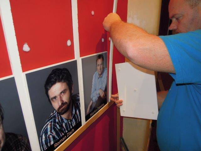 Protože vedení divadla požadovalo možnost výměny fotografií, vzhledem k obměňování hereckého souboru, vyvinuli jsme nový postup snímatelného připevnění pomocí terčíků duct tape s výseky suchých zipů v balení duo-pack. Na zeď se nejprve nalepí výseky duct tape o průměru 30 mm, na něj výsek suchého zipu o průměru 19 mm a na zadní stranu desky s fotografií se nalepí výsek suchého zipu o průměru 19 mm.