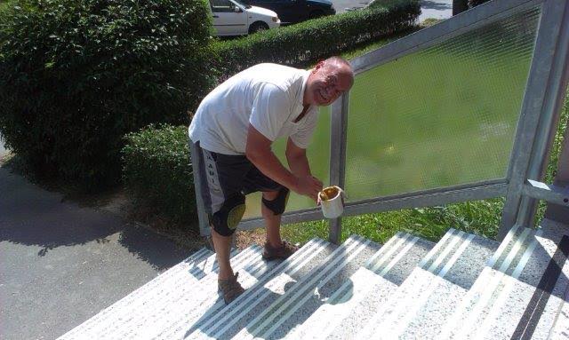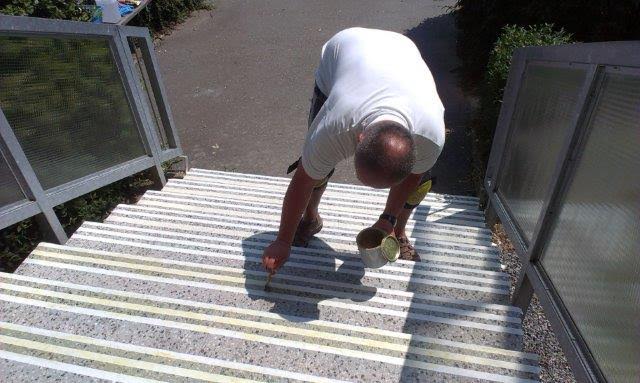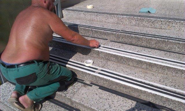 Proto byl navržen pro opravu složitější postup. Nejprve jsme odstranili stěrkami zbytky staré pásky, potom jsme pomocí odlepiče L152 odstranili zbytky lepidla se schodů. Celé schody jsme aktivovali aktivátorem L151 a protože bylo nutné použít primer s ohledem na stav povrchu schodů, maskovali jsme okolí pásek maskovací páskou, abychom nepocintali schody primerem. Potom jsme provedli nátěr schodů primerem. Po zaschnutí primeru jsme naválečkovali protiskluzovou pásku a potom jsme odstranili maskovací pásky.