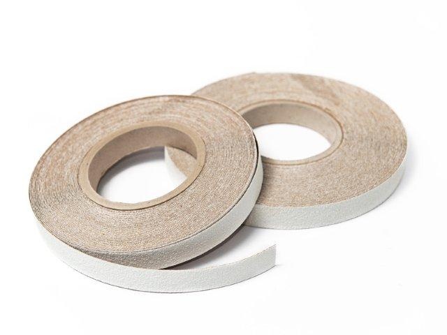 Samolepící protiskluzová páska v šířce 25 milimetrů navinutá na roli dlouhé 18,3 metrů v bílé barvě. Pokud máte v domácnosti, nebo podniku, v interiéru, či exteriéru místa, kde hrozí úraz při pádu na kluzkém povrchu, nečekejte na nehodu a využijte jednoduché a výhodné řešení - samolepící protiskluzovou pásku - ještě dnes. Samolepící protiskluzové pásky jsou vhodné především na podlahové krytiny, schody a místa s vyšším rizikem uklouznutí. Aplikace je možná jak v interiéru, tak exteriéru. Protiskluzovky jsou vyrobeny z vrstvy speciálního plastického filmu, který je na spodní straně pokryt vrstvou vysoce přilnavého a trvanlivého akrylového lepidla a na horní, funkční straně, je povrstven korundovými zrny v přesně vyvážené frakci tak, aby se dosáhlo maximálního koeficientu tření a vysoké trvanlivosti. Princip protiskluzové pásky Korund je materiál používáný předními výrobci brusiv pro jeho nesporné kvality - především tvrdost. Korundové krystaly jsou čiré, což nám umožňuje výrobu samolepících protiskluzových pásek různých barevných provedení včetně čiré. Údržba Samolepící protiskluzové pásky se dají čistit běžnými čistícími prostředky. Aplikace protiskluzové pásky Před lepením protiskluzové pásky doporučujeme povrch důkladně očistit a odmastit. Neodmašťujte benzinem, nejlepší je aktivátor L151. V místech, kde nelze zajistit 100% přilnutí k povrchu (spáry dlaždic a podobně) doporučujeme pásy naříznout a dokonale přilepit, případně spáry pod protiskluzovou páskou tmelem dokonale zarovnat. Protiskluzová páska by neměla být lepena při teplotách pod patnáct stupňů.