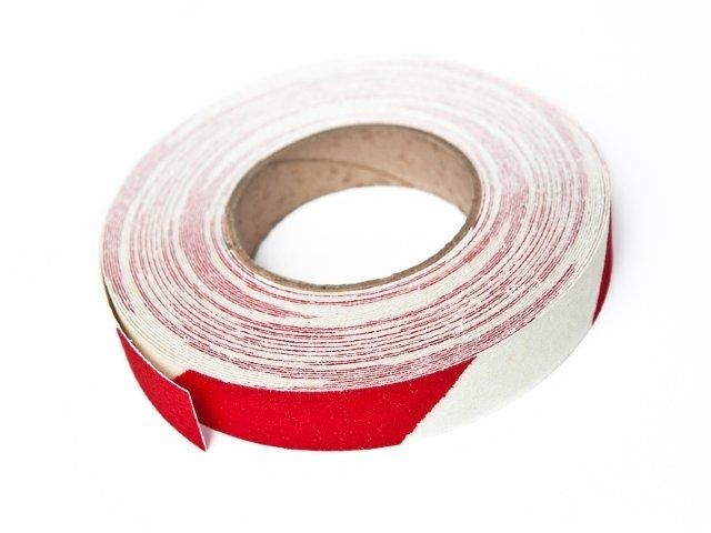 Bíločervená bezpečnostní samolepící protiskluzová páska 25 mm x 18.3 m. Samolepící protiskluzové pásky jsou vhodné především na podlahové krytiny, schody, nášlapy a místa s vyšším rizikem uklouznutí. Aplikace je možná jak v interiéru, tak exteriéru. Protiskluzovky jsou vyrobeny z vrstvy speciálního plastického filmu, který je na spodní straně pokryt vrstvou vysoce přilnavého a trvanlivého akrylového lepidla a na horní, funkční straně, je povrstven korundovými zrny v přesně vyvážené frakci tak, aby se dosáhlo maximálního koeficientu tření a vysoké trvanlivosti. Korund je materiál používáný předními výrobci brusiv pro jeho nesporné kvality - především tvrdost. Korundové krystaly jsou čiré, což nám umožňuje výrobu samolepících protiskluzových pásek různých barevných provedení včetně čiré. Bíločervená páska je předepsána pro průmyslová schodiště a podlahy, ale i pro veřejné dopravní prostředky, její použití je nutné pro splnění bezpečnostních norem. Samolepící protiskluzové pásky se dají čistit běžnými čistícími prostředky postřikem a kartáči, nevhodné jsou utěrky, hadry a mopy, které pouštějí vlákna. Před lepením protiskluzové pásky doporučujeme povrch důkladně očistit a odmastit. Neodmašťujte benzinem, nejlepší je aktivátor L151. V místech, kde nelze zajistit 100% přilnutí k povrchu (spáry dlaždic a podobně) doporučujeme pásy naříznout a dokonale přilepit. Aplikaci protiskluzovky je vhodné provádět při teplotě vyšší 15 stupňů Celsia.Údržba